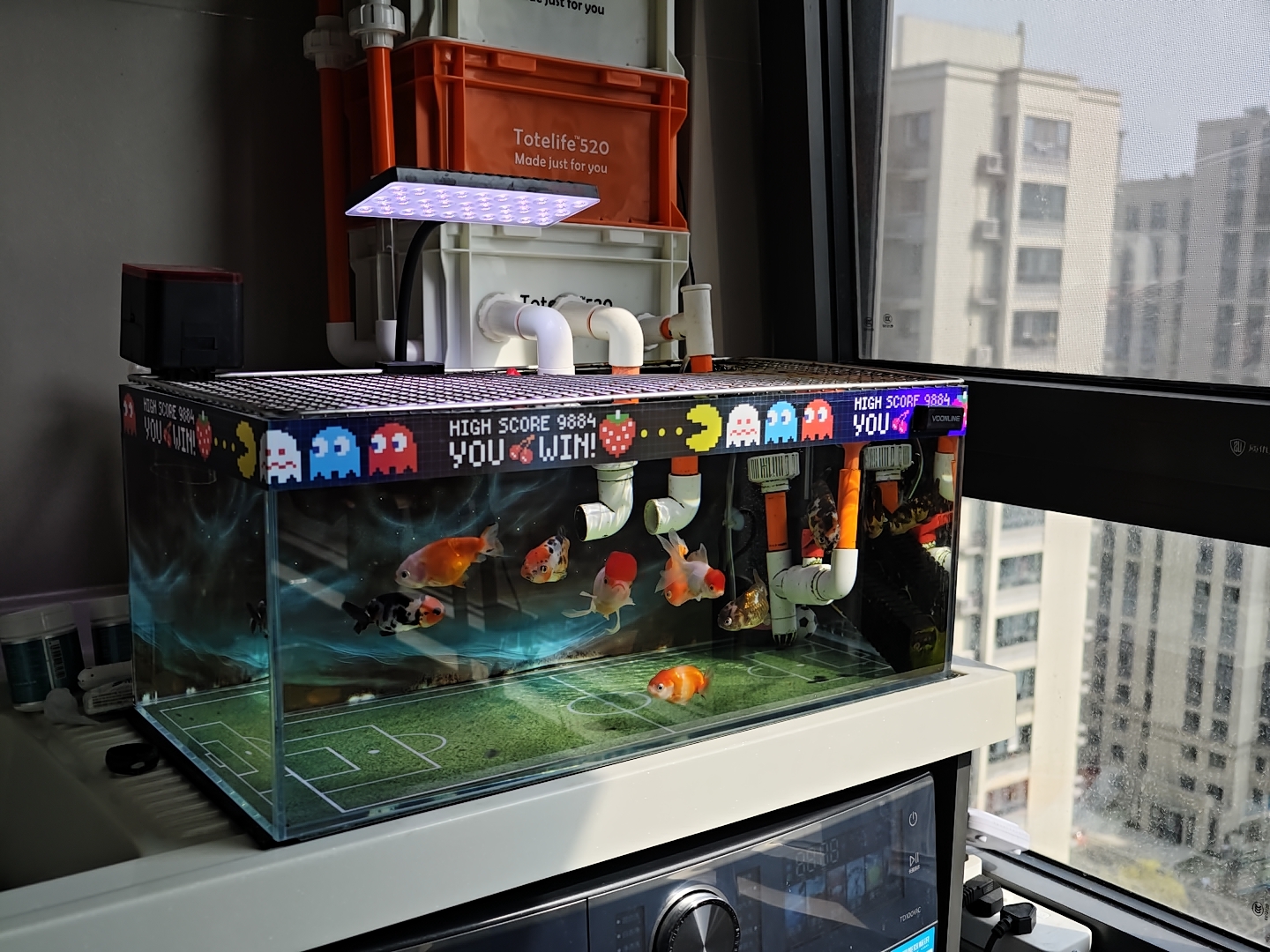 乌龟也从冬眠中苏醒,和一群黑尾大勾在水里游来游去。我发觉养鱼越来越简单了,另一个小缸里养了十条兰寿,一个冬天过来全都活得好好的。